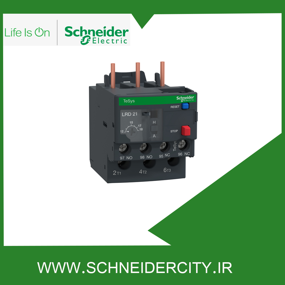 رله حرارتی TeSys LRD21 اضافه بار 18 آمپر690 ولت AC/DC است که در محدوده تنظیم جریان حرارتی 12 – 18 آمپر با کلاس تریپ 10 برای حفاظت از موتورهای 3 فاز 0.12-0.18 کیلووات 400 ولت استفاده می ­شود. بی متال  اشنایدر مجهز به سیستم تشخیص قطع فاز است. در این تجهیز  می­ توان با یک ولوم قابل تنظیم رنج جریان را انتخاب کرد که هم با حالت دستی و هم اتوماتیک قابل تنظیم است.