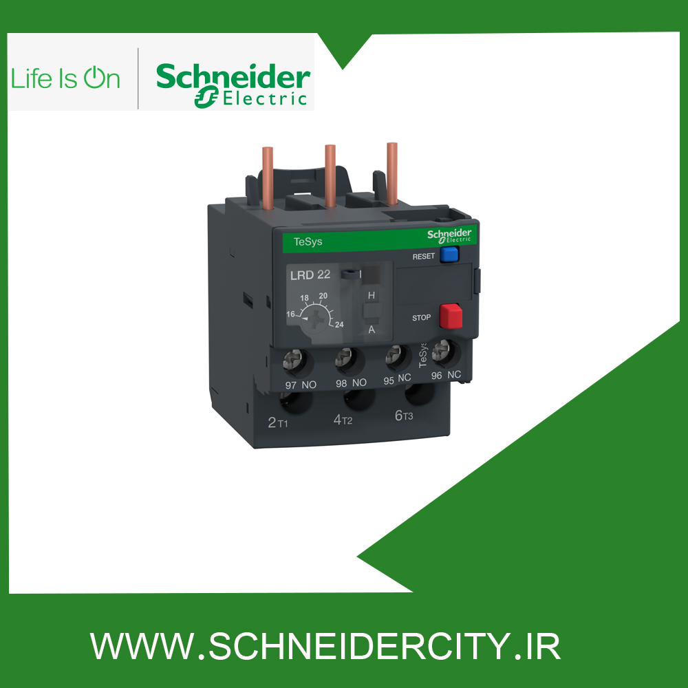 رله حرارتی TeSys LRD22 اضافه بار 24 آمپر690 ولت AC/DC است که در محدوده تنظیم جریان حرارتی 16 – 24 آمپر با کلاس تریپ 10 برای حفاظت از موتورهای 3 فاز 0.12-0.18 کیلووات 400 ولت استفاده می ­شود. بی متال  اشنایدر مجهز به سیستم تشخیص قطع فاز است. در این تجهیز  می­ توان با یک ولوم قابل تنظیم رنج جریان را انتخاب کرد که هم با حالت دستی و هم اتوماتیک قابل تنظیم است.