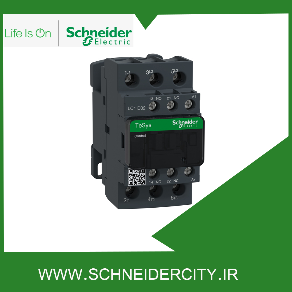 کنتاکتور 32 آمپر LC1D32E7 اشنایدر به منظور کنترل بار عمومی و موتور مورد استفاده قرار می گیرد. این کنتاکتور از نوع سه پل بوده و سه کنتاکت با قدرت NO دارد که ترکیب آن ها به صورت 1NO + 1NC است. جریان کاری این قطعه 32 آمپر و ولتاژ تغذیه بوبین یا ولتاژ کنترلی آن 48 ولت AC است.