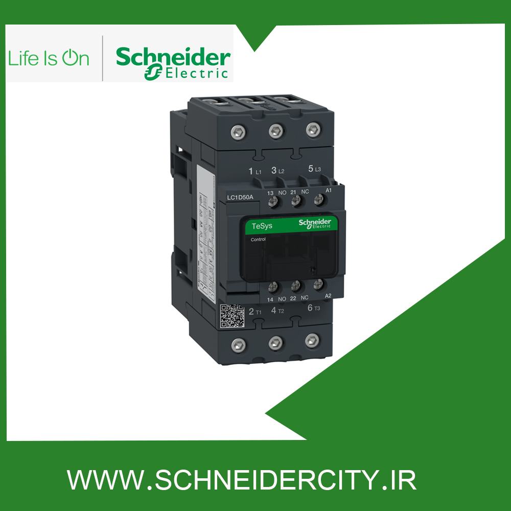کنتاکتور 50 آمپر LC1D50AE7 اشنایدر به منظور کنترل بار عمومی و موتور مورد استفاده قرار می گیرد. این کنتاکتور از نوع سه پل بوده و سه کنتاکت با قدرت NO دارد که ترکیب آن ها به صورت 1NO + 1NC است. جریان کاری این قطعه 50 آمپر و ولتاژ تغذیه بوبین یا ولتاژ کنترلی آن 48 ولت AC است.