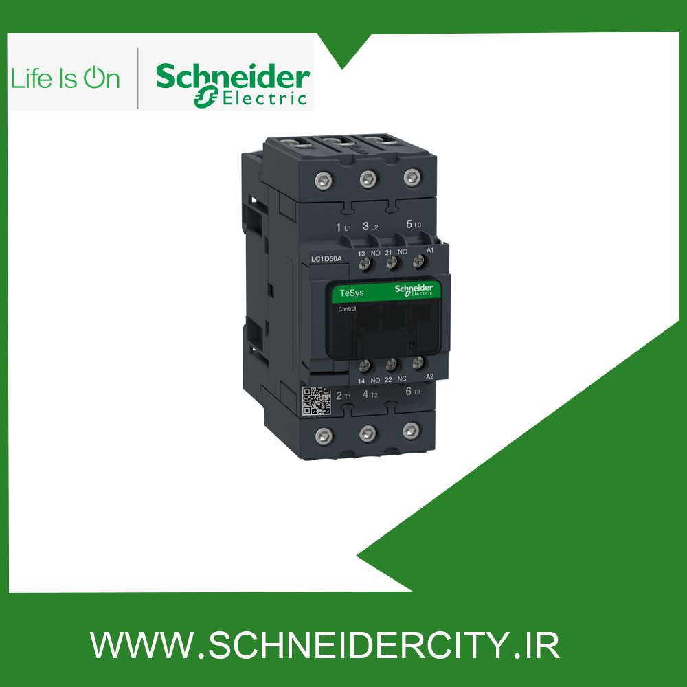 کنتاکتور 50 آمپر LC1D50AM7 اشنایدر به منظور کنترل بار عمومی و موتور مورد استفاده قرار می گیرد. این کنتاکتور از نوع سه پل بوده و سه کنتاکت با قدرت NO دارد که ترکیب آن ها به صورت 1NO + 1NC است. جریان کاری این قطعه 50 آمپر و ولتاژ تغذیه بوبین یا ولتاژ کنترلی آن ۲۲۰ ولت AC است.