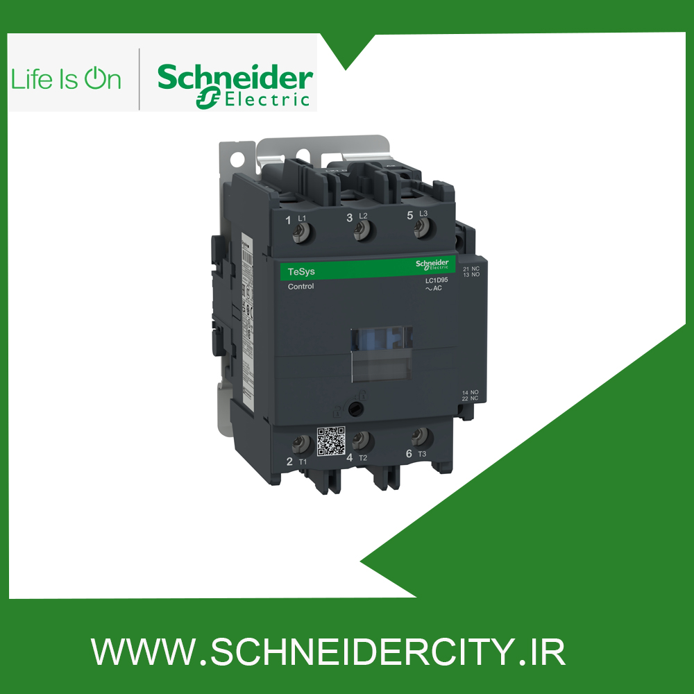 کنتاکتور 95 آمپر LC1D95E7 اشنایدر به منظور کنترل بار عمومی و موتور مورد استفاده قرار می‌ گیرد. این کنتاکتور از نوع سه پل بوده و سه کنتاکت با قدرت NO دارد که ترکیب آن ها به صورت 1NO + 1NC است. جریان کاری این قطعه 95 آمپر و ولتاژ تغذیه بوبین یا ولتاژ کنترلی آن 48 ولت AC است.